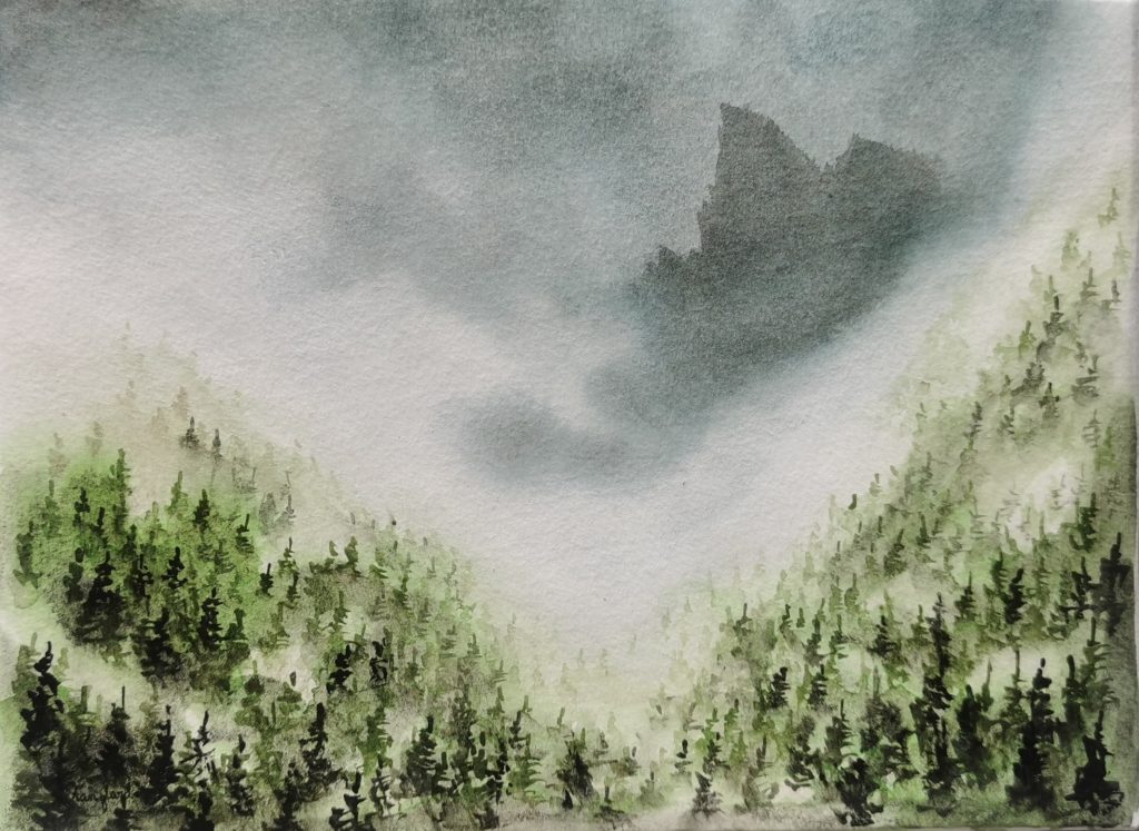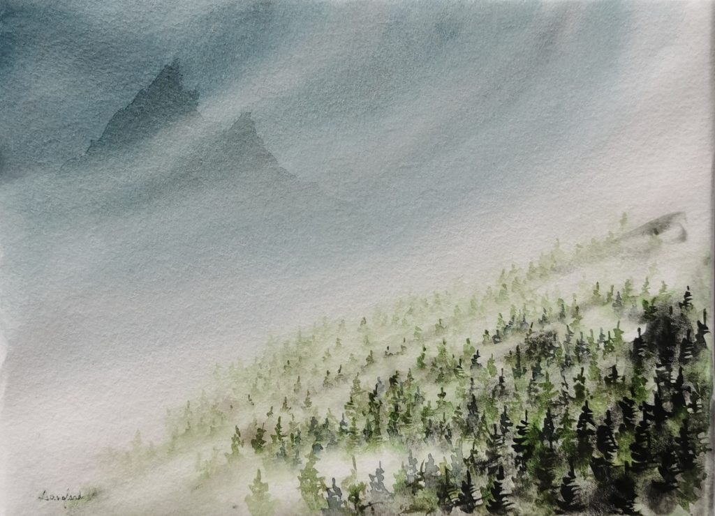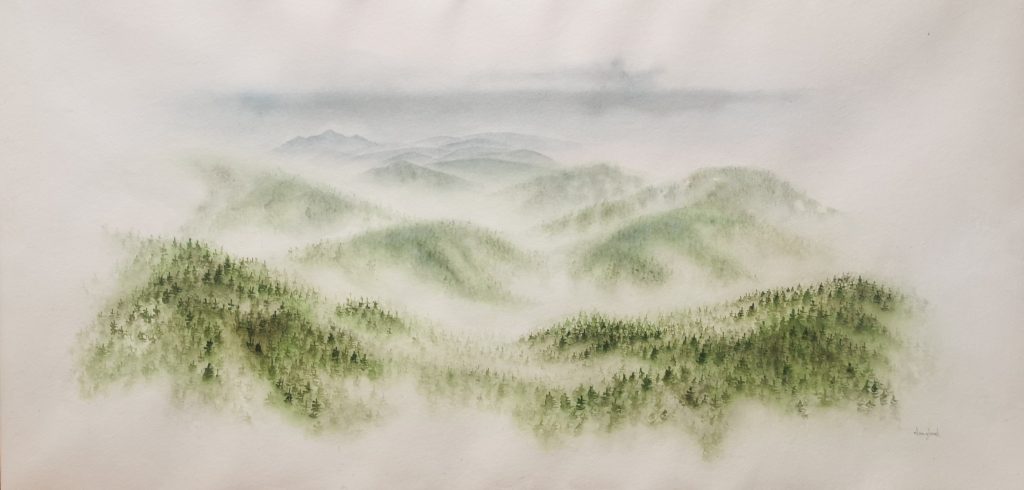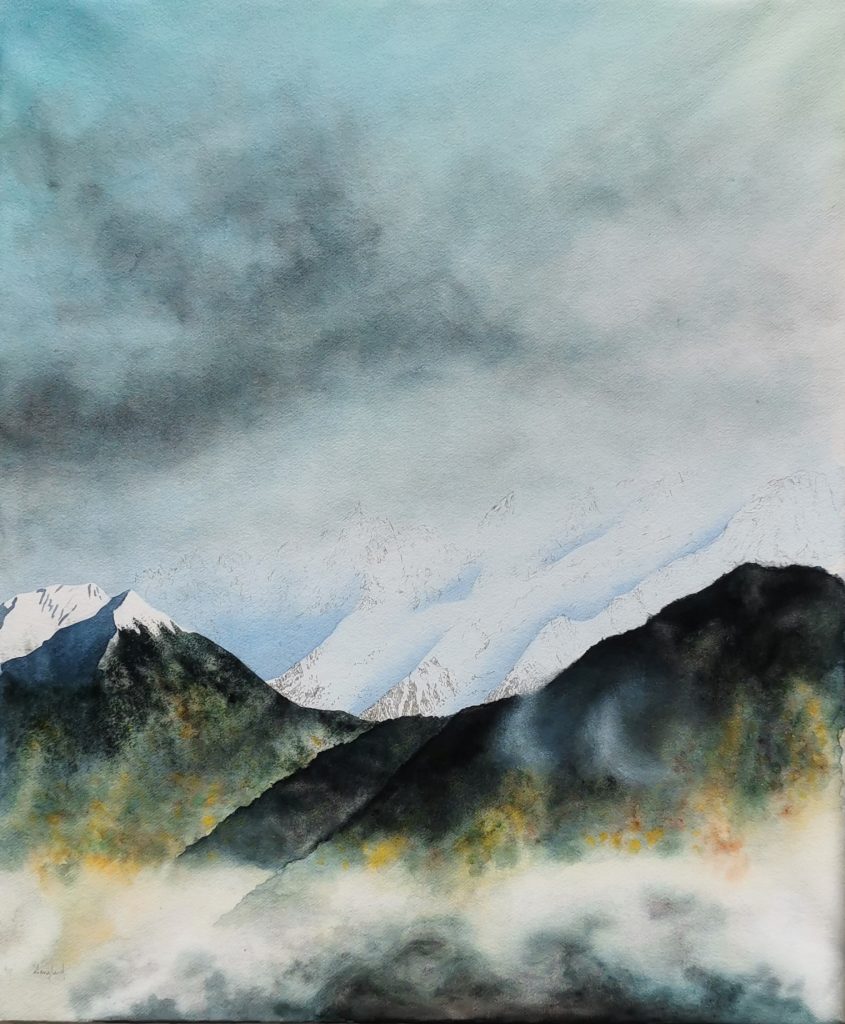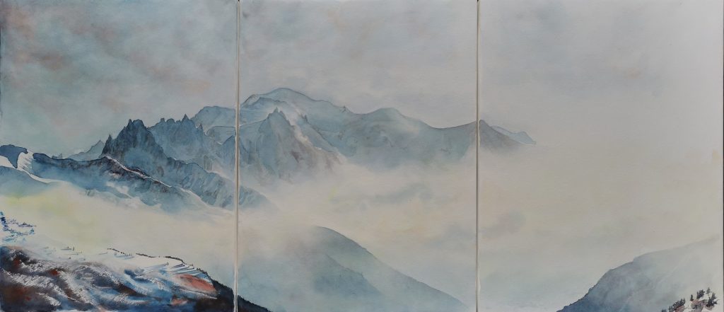 Vallée, 50*70 cm, aquarelle sur papier coton, 920€. DISPONIBLE/AVAILABLEAu bout du monde, 33*68cm, aquarelle sur papier coton, 590€. DISPONIBLE/AVAILABLE Le passage, 50*70cm, aquarelle, encre et acrylique sur papier coton, 790€. DISPONIBLE/AVAILABLE Ombre derrière la brume, 18*24cm, aquarelle sur papier coton, 110€. DISPONIBLE/AVAILABLE Versant brumeux, 18*24cm, aquarelle sur papier coton, 110€. DISPONIBLE/AVAILABLE Le vent chasse la brume, 18*24cm, aquarelle sur papier coton, 110€. DISPONIBLE/AVAILABLE Apatite verte en brume, 33*68cm, aquarelle sur papier coton, 590€. DISPONIBLE/AVAILABLE Mont-Blanc, 30*40 en triptyque, aquarelle et pastel sur papier coton, 900€. DISPONIBLE/AVAILABLE Vague alpine, 65*46cm, aquarelle sur papier coton, 750€. DISPONIBLE/AVAILABLE